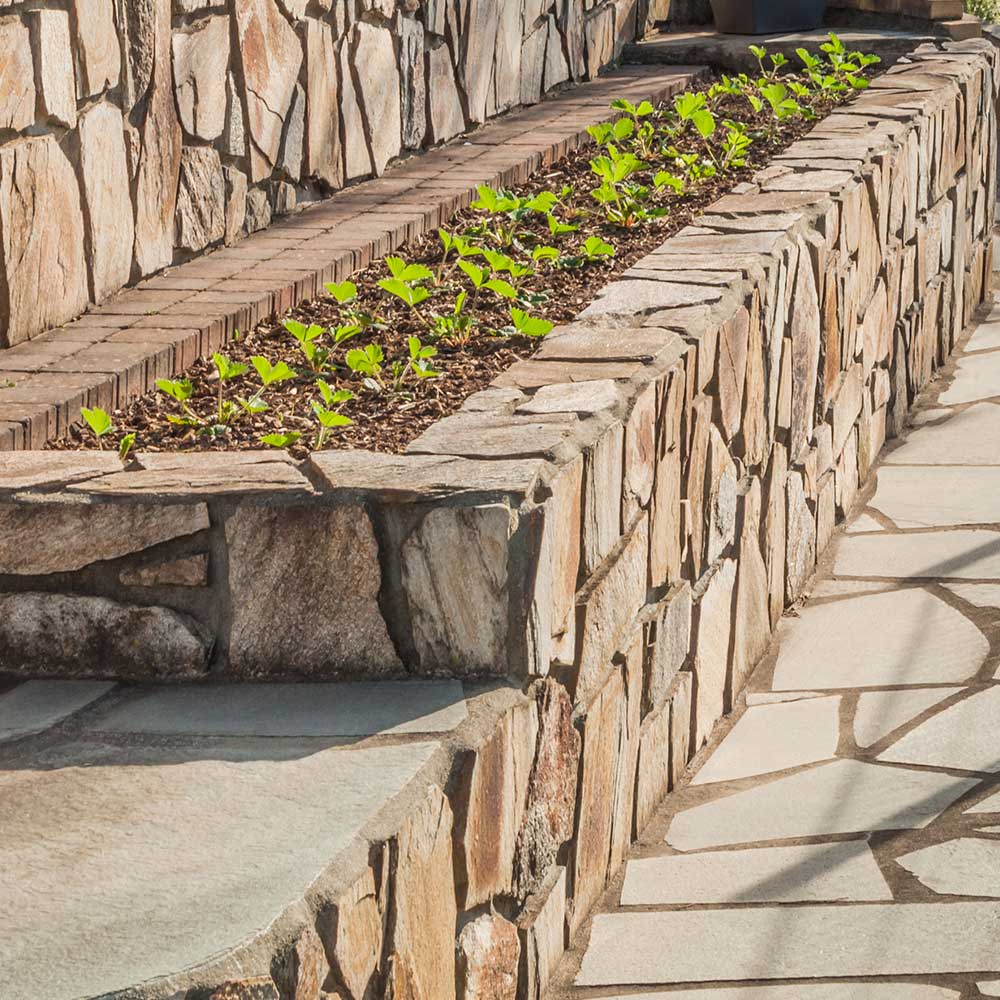 Wände aus Naturstein sind wahre Alleskönner: Sie spenden Schatten, stabilisieren Hanglagen, strukturieren den Garten und harmonieren perfekt mit Begrünung. Zwischen den Fugen und Ritzen von Trockensteinmauern können Sie Lieblingspflanzen einpflanzen und so eine lebendige grüne Wand schaffen, die gleichzeitig Kleinlebewesen wie Käfern und Eidechsen einen geschützten Lebensraum bietet.